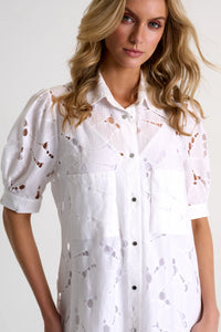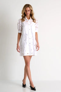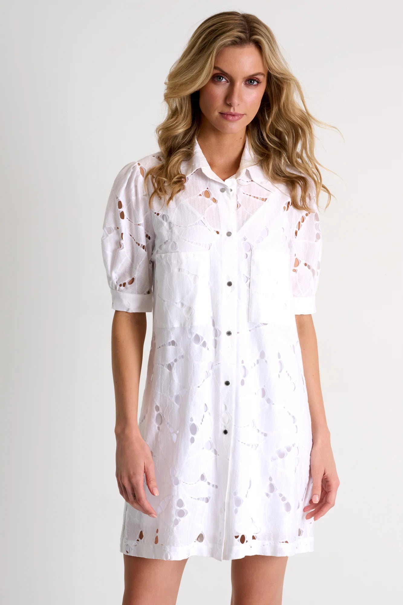 With delicate modern lace patterns, this charming dress features front pockets and elegant, short puff sleeves, complete with an included slip dress for added comfort. Its intricate details embody finesse and grace.