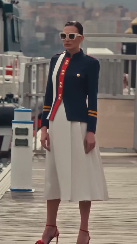 This iconic garment that fuses classic elegance with a contemporary military design. Crafted in a sophisticated green, this piece stands out for its vertical red and white stripes, which add contrast and dynamism to its aesthetic.