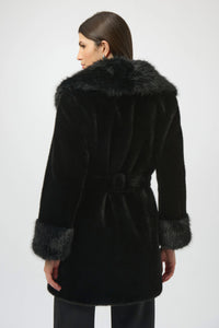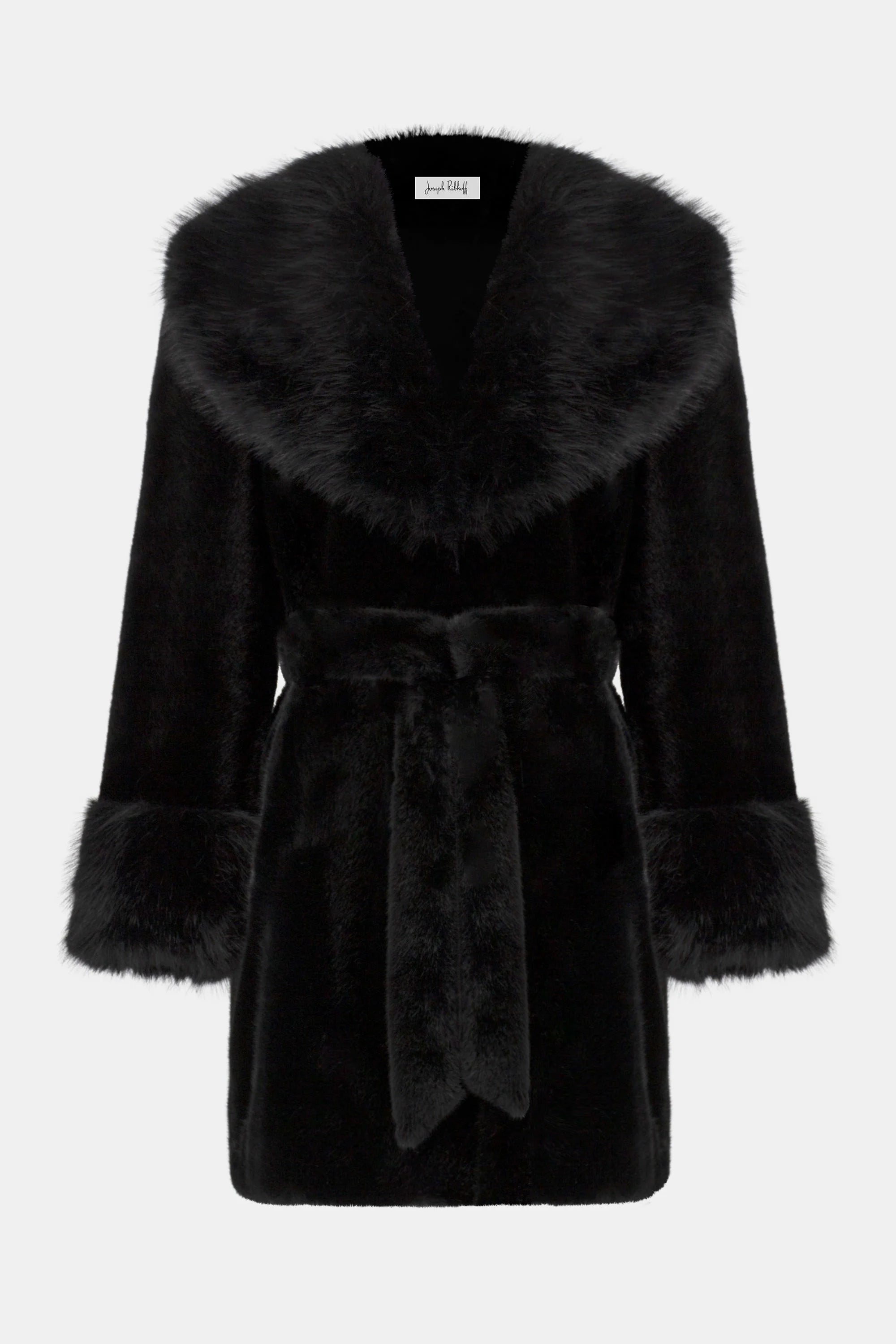 Embrace the plush elegance of faux fur with this fitted coat, featuring a luxurious long-hair shawl collar and cuffed sleeves. A belted snap-front closure enhances its chic appeal, while side pockets offer both style and convenience.