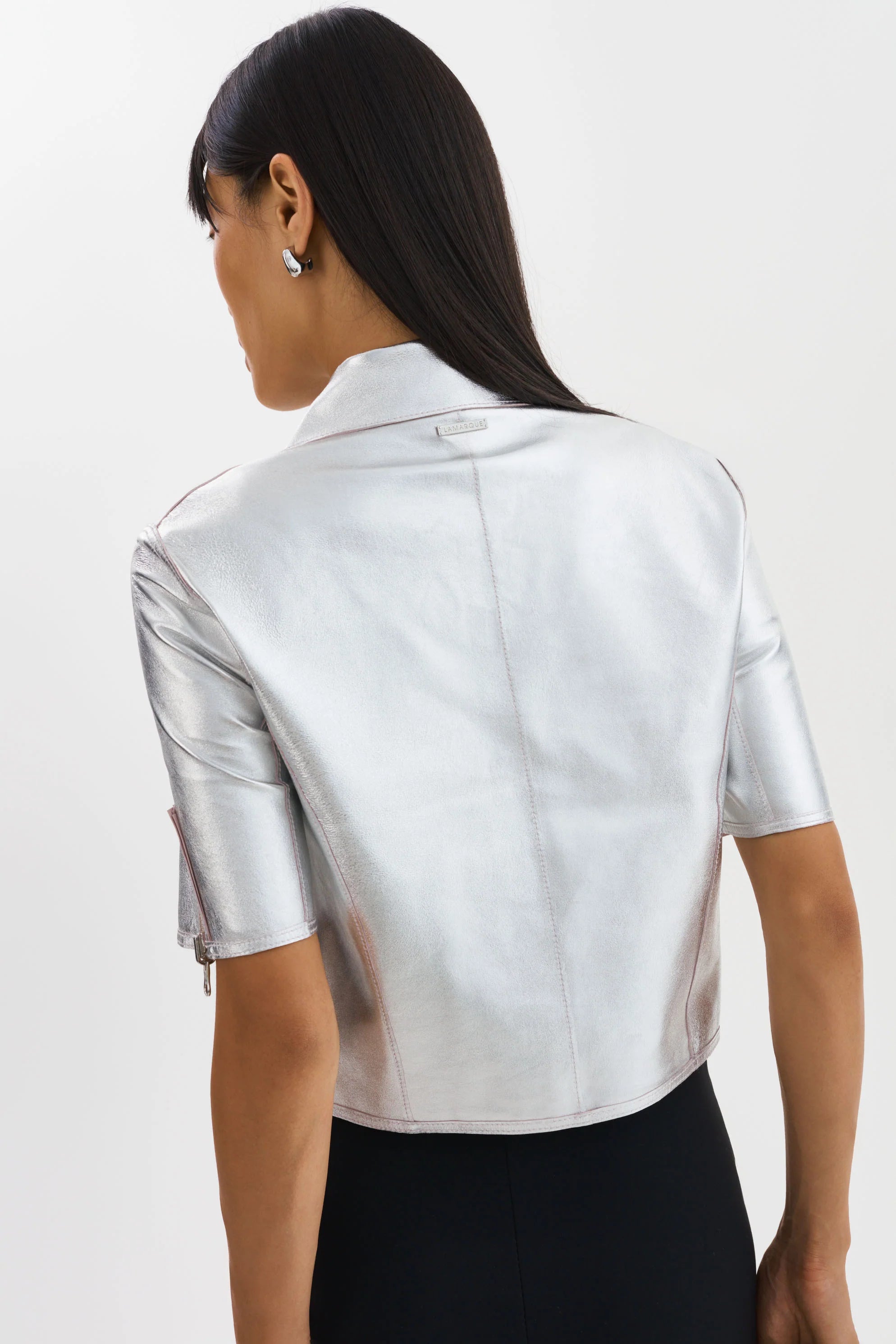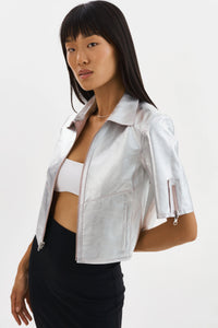 The SEVANA is a versatile essential for your wardrobe. Featuring a metallic foil interior, it offers double the styling possibilities. Zipper-detail short sleeves add a touch of edge to the sophisticated silhouette. Pair it with high-waisted shorts and a simple white tee for a daytime look, or layer it over dresses for a night out.