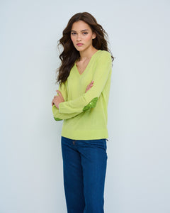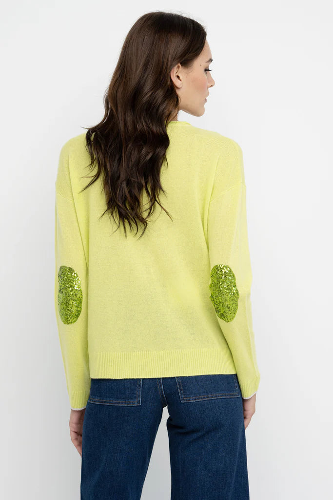 Spring Bling adds a LISA TODD wink to your luxe Cashmere sweater with sequin elbow patches and a rolled-edge V-neck that gives it a modern twist.