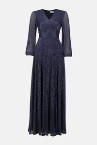 This full-length gown radiates class and sophistication, featuring a wrap-style V-neckline, a wide spliced waistband, and long puffed sleeves for a timeless, elegant look. Crafted from shimmering plissé fabric, it cascades gracefully to the floor, creating a sweeping, unforgettable silhouette. The A-line design ensures a flattering fit, enhancing your figure with effortless beauty. Part of the Signature Collection.