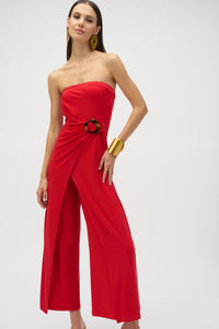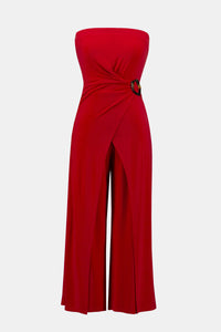This silky knit wrap jumpsuit showcases sheer glamour. The bodice flaunts a strapless, bandeau style designed with a hidden elastic to ensure a perfect fit and a wide-leg silhouette to add grace to every movement. The side of the garment is beautifully draped and adorned with a faux tortoise shell buckle for a hint of dramatic flair.